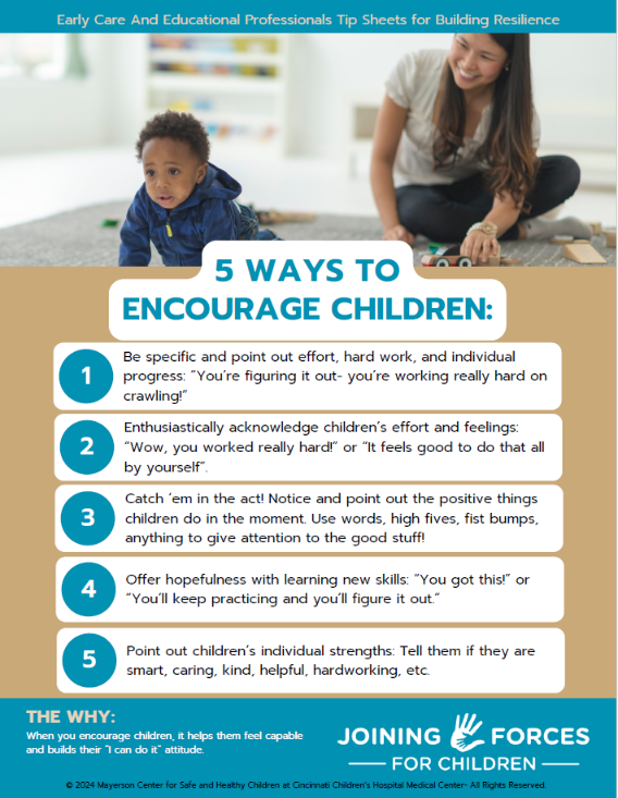 Introduction: 5 Ways to Encourage Children Download the Tip Sheet Here Handout 5 Ways to Encourage Children Video Length: 1:22 minutes Encouragement helps children build confidence, resilience, and the belief that effort leads to growth. As you watch, ask yourself: How do your words and actions show children, “I believe in you”?